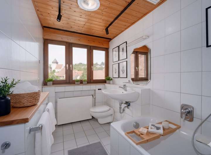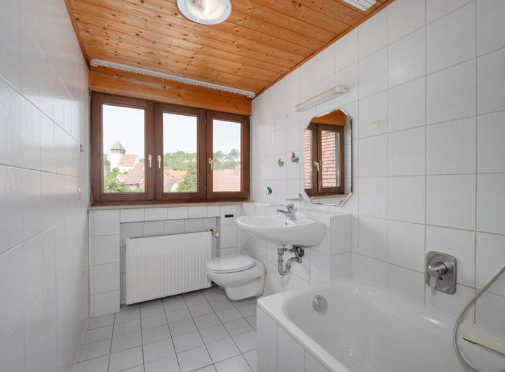 - Tageslichtbadezimmer im Obergeschoss, raumhochgefließt, Badewanne, Waschtisch, WC,