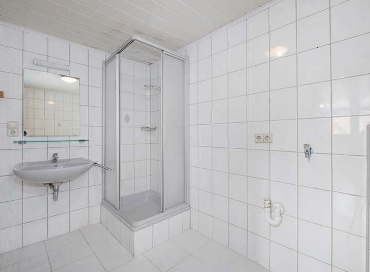 - innenliegendes Badezimmer im Erdgeschoss, raumhochgefließt, Dusche, Waschtisch, Waschmaschinenanschluss