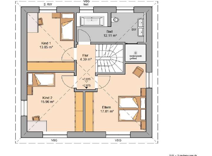 Von der Diele der Stadtvilla Pura aus erreichen Sie den Hauswirtschaftsraum, das praktische WC sowie die Küche und das großzügige Wohn- und Esszimmer. Die Stadtvilla Pura bietet sowohl im Erd- als auch im Obergeschoss zur Gartenseite hin bodentiefe Fenster. Über eine u-förmige Treppe gelangen Sie ins Obergeschoss. Ein Kinderzimmer ist zur Eingangsseite gerichtet, das andere mit einem bodentiefen Fensterelement zur Gartenseite hin. Das Elternschlafzimmer wird ebenfalls durch bodentiefe Fenster lichtdurchflutet. Das Familienbadezimmer verfügt über eine große, bodengleich geflieste Dusche sowie eine Badewanne.