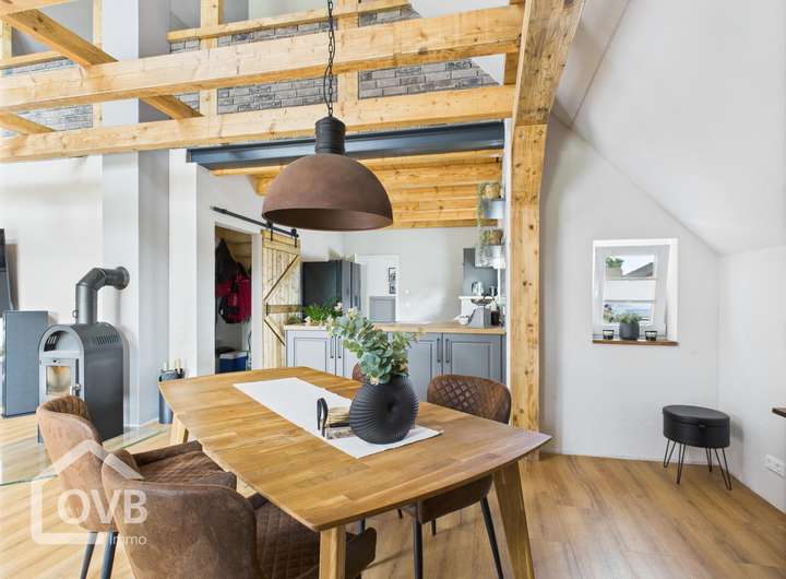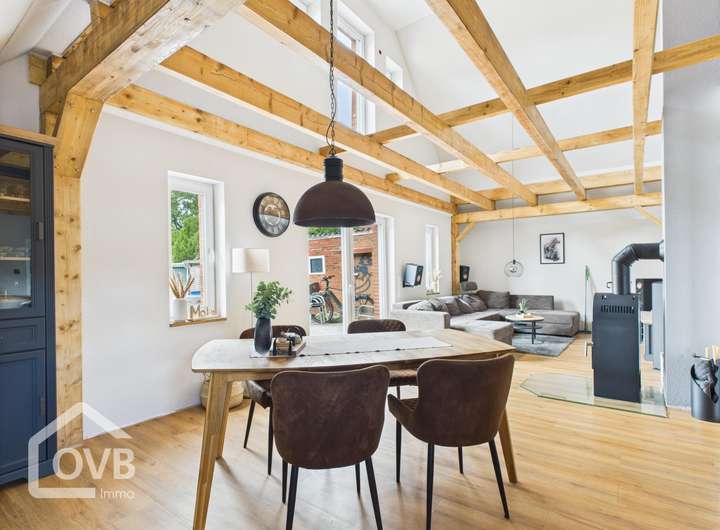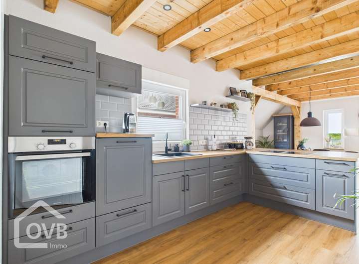 Das Absolute Highlight des Erdgeschosses: Ein offener, lichtdurchfluteter Wohn-/ Ess-/ Kochbereich mit offener Balkenlage und Galerie, der am Kamin zum Verweilen einlädt. Blickfang: Die moderne Einbauküche im Landhausstil. Ein richtiger Wohntraum - hier bleiben keine Wünsche offen.