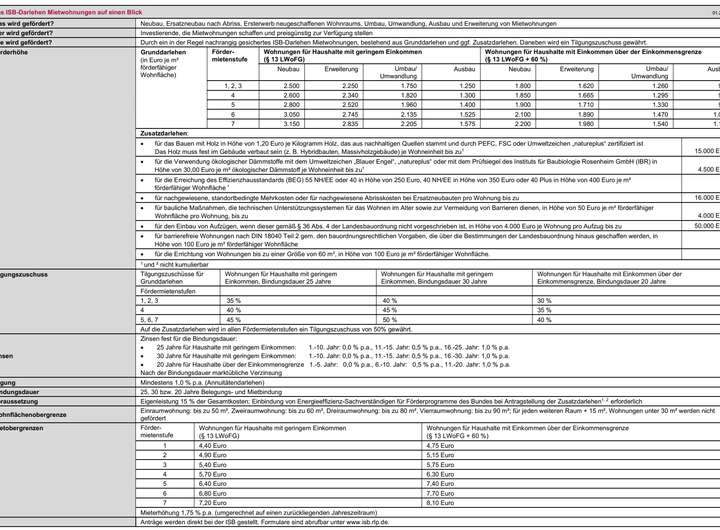 Bei einer Bebauung mit einem Mehrfamilienhaus besteht die Möglichkeit ISB-Förderung: die neu entstehenden Wohnungen durch Mittel der Investitions- und Strukturbank Rheinland-Pfalz (ISB Rheinland-Pfalz) öffentlich zu fördern. Die Details sind im Programm 551