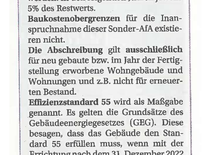 Sofern das neu entstehende Gebäude vermietet wird, besteht die Möglichkeit durch die zwischenzeitlich beschlossene Änderung der Gebäudeabschreibung die neuen Wohnungen mit jährlich 5 % bezogen auf den jeweiligen buchwert/Restwert abzuschreiben. Hierdurch werden hohe Steuervorteile erzielt.