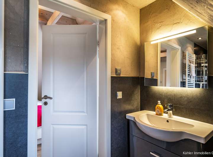 Im Dachgeschoss befinden sich zwei weitere Schlafzimmer, jeweils mit eigenem Badezimmer en suite. Diese durchdachte Aufteilung schafft Rückzugsmöglichkeiten und Privatsphäre für alle Bewohner. Ein weiteres Zimmer bietet flexible Nutzungsmöglichkeiten, ob als Büro, Kinderzimmer, Atelier oder persönlicher Rückzugsort.