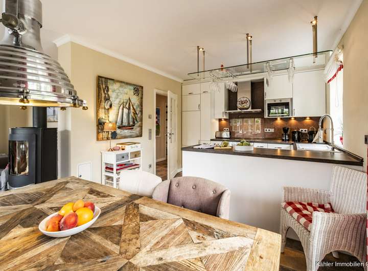 Im Erdgeschoss erwartet Sie ein lichtdurchfluteter, großzügiger Wohn und Essbereich mit einer offenen Küche. Große Fensterflächen sorgen für viel Licht und eröffnen den Blick in den Garten. Ein Kaminofen schafft an kühlen Tagen wohltuende Wärme und eine besonders gemütliche Wohnatmosphäre. Die Küche bietet hochwertige Einbauten, ausreichend Stauraum und eine harmonische Kombination aus Funktionalität und Design, ideal für gemeinsames Kochen und Genießen.