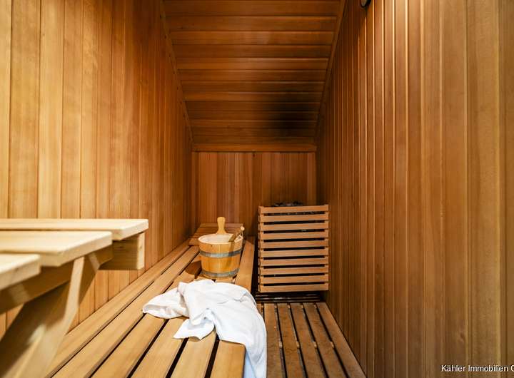 Ein Schlafzimmer mit angrenzendem Duschbad auf dieser Etage ermöglicht komfortables Wohnen auf einer Ebene, ideal auch für Gäste oder bei eingeschränkter Mobilität. Zusätzlich steht Ihnen eine private Sauna zur Verfügung, ein Ort der Entspannung in den eigenen vier Wänden. Ein Hauswirtschaftsraum mit Waschmaschinenanschluss ergänzt das praktische Raumangebot.
