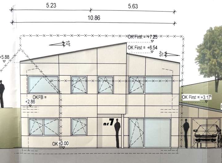 Eine Planung für ein freistehendes Einfamilienhaus mit ca. 120 m² Wohnfläche, zwei Vollgeschossen und angeschlossener Garage liegt bereits vor.