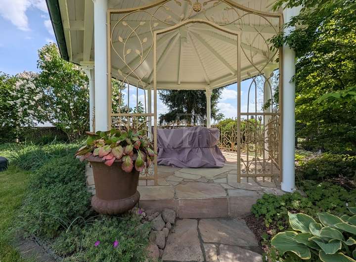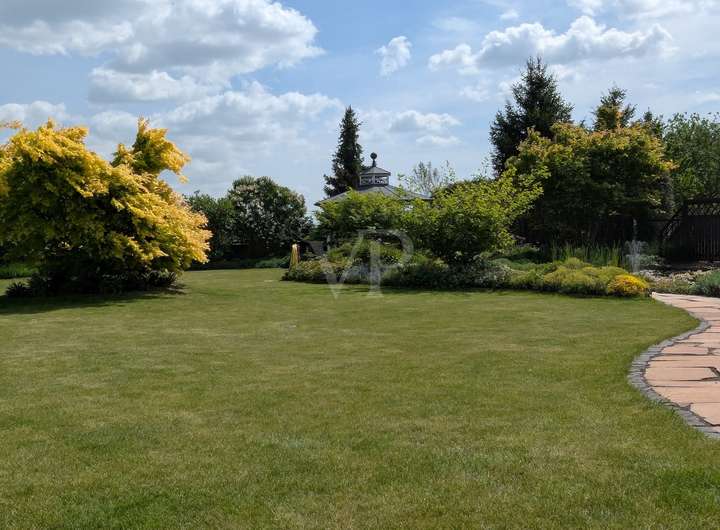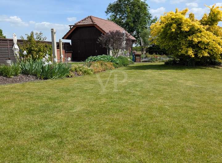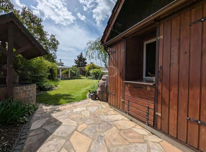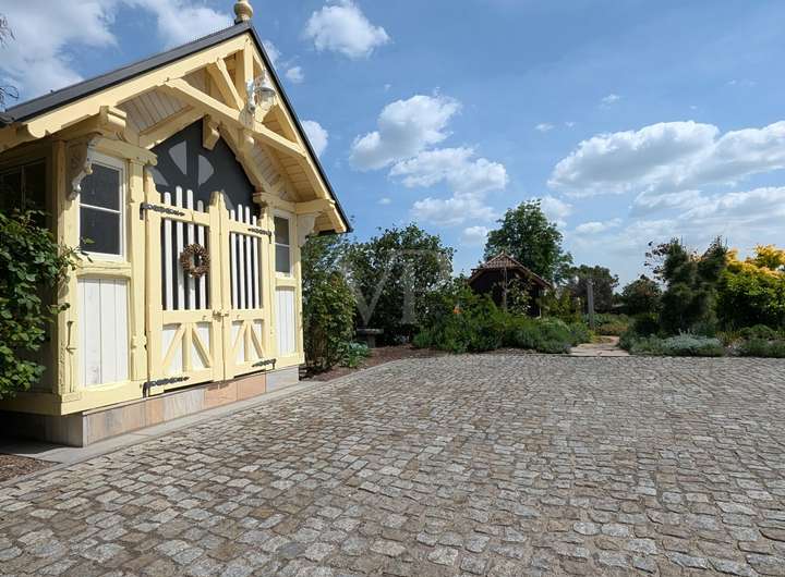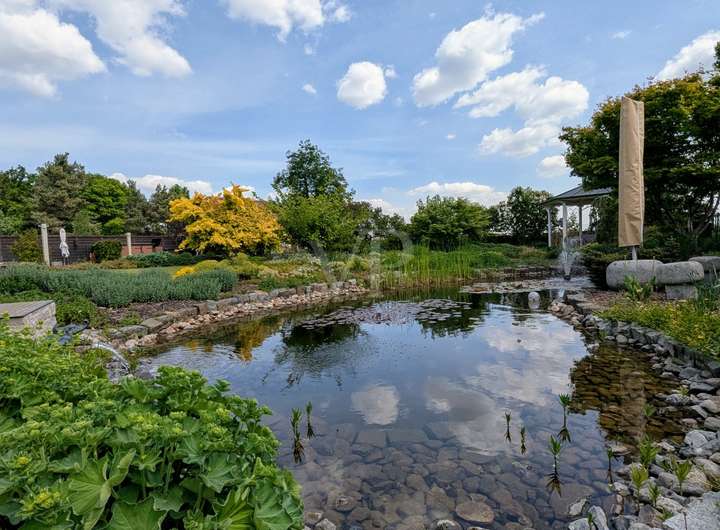 Das großzügige Grundstück wurde mit viel Liebe zum Detail von einem Landschaftsgärtner gestaltet und erinnert an einen perfekt komponierten Park. Grüne Rasenflächen, hochwertige Pflanzen, Natursteinelemente, ein idyllischer Teich, ein gemütlicher Pavillon, ein romantisches Teehäuschen und mehrere Sitzplätze bieten vielfältige Rückzugsorte im Grünen. Ein eigener Brunnen unterstützt die Gartenbewässerung. Abgerundet wird das Ensemble durch eine moderne Scheune, die als perfekt sortierte Werkstatt mit zusätzlichem kleinen Küchenbereich und einem weiteren Abstellbereich genutzt wird.