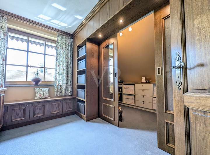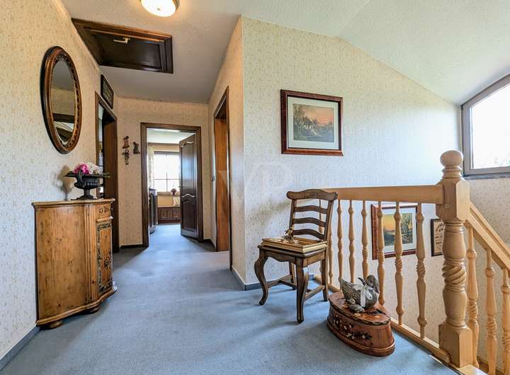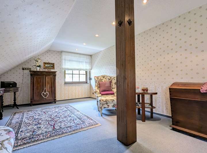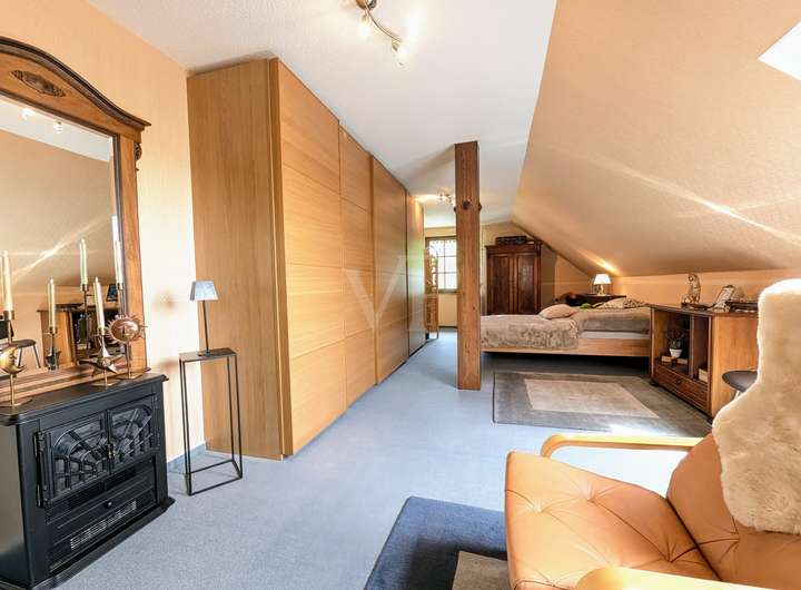 Das Obergeschoss bietet Raum für die ganze Familie. Ein Kinderzimmer, ein sehr großer und gemütlicher Wohnraum (ideal als Hobby-, Wohn- oder Schlafraum), das Hauptschlafzimmer, eine exklusive Ankleide sowie ein modernes Badezimmer mit Dusche sorgen für Komfort und Wohlfühlambiente.