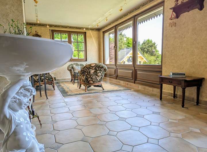 Bereits beim Betreten empfängt Sie ein lichtdurchfluteter Eingangsbereich, der einem Wintergarten gleicht und einen wunderbaren Blick ins gepflegte Grundstück bietet. Das großzügige Wohnzimmer mit Kamin lädt zu gemütlichen Stunden ein. Eine stilvolle Bibliothek, ein elegantes Bad mit Badewanne, ein Esszimmer, die voll ausgestattete Küche sowie ein Arbeitszimmer komplettieren das durchdachte Raumkonzept dieser Ebene.