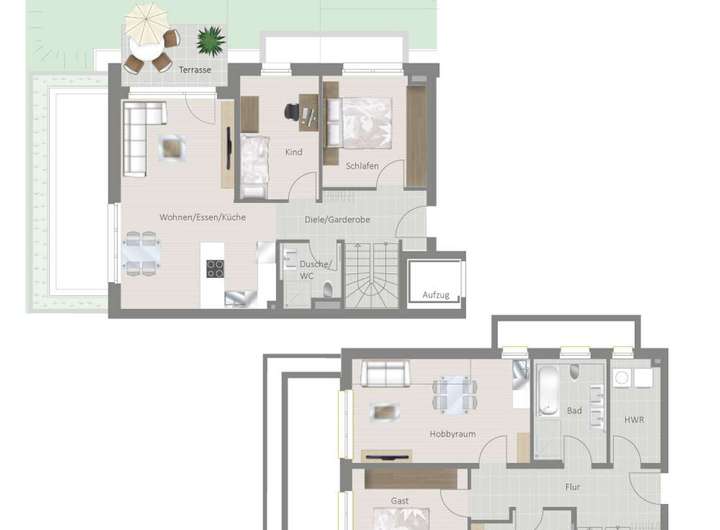 5,5 Zimmer mit Wohnen/Essen, offene Küche, Schlafen, Kind bzw Büro, Tageslichtbad, sep Gäste-WC im Erdgeschoss.