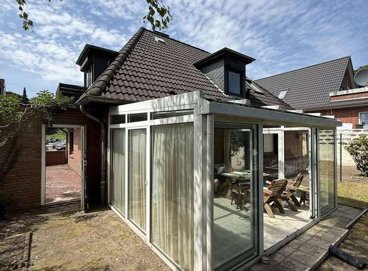 Das 1968 erbaute und in den 1990er Jahren modernisierte Einfamilienhaus befindet sich in ruhiger Lage im Flensburger Norden. Im Erdgeschoss befindet sich das Wohn-, das Schlaf- und das Esszimmer, ein Vollbad, das separate Gäste-WC, die Küche sowie ein ca. 20 qm großer (warm-) Wintergarten. Im Dachgeschoss sind neben Schlaf- und Wohnzimmer mit Essecke und Balkon ein weiteres Bad sowie eine Küche vorhanden. Eine Nutzung als Einliegerwohnung ist daher denkbar. Das Grundstück verfügt über einen terrassierten Garten. Zum Abstellen von PKW dienen zwei große Garagen mit elektrischen Toren. Die Beheizung erfolgt mittels Fernwärme. Ferner ist das gesamte Haus unterkellert.