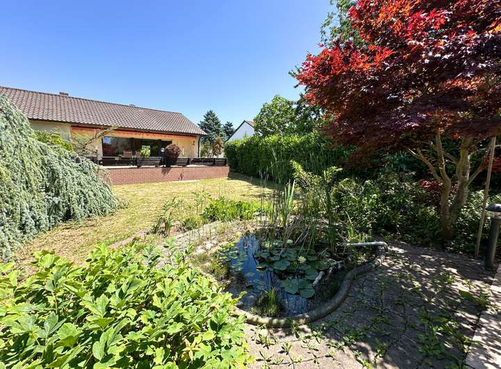Die große Terrasse und der schöne Garten lädt zum entspannen ein. Insgesamt ist das Grundstück ca. 820 qm groß und bietet neben dem Haus noch eine Garage mit Zugang zum Untergeschoss und einem massiv errichteten großzügigen Gartenhaus bzw. Freisitz mit Teich.