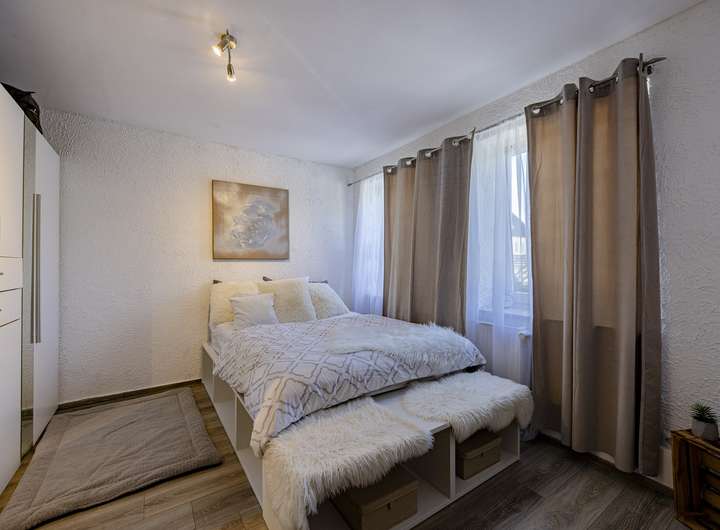 Das Obergeschoss ist als separate Wohneinheit nutzbar und verfügt über mehrere Zimmer, eine Küche und ein Badezimmer. Das gesamte Erdgeschoss sowie das Schlafzimmer im Obergeschoss wurden saniert. Die restlichen Flächen stammen noch aus der Bauzeit und warten darauf von Ihnen neu gestaltet zu werden.