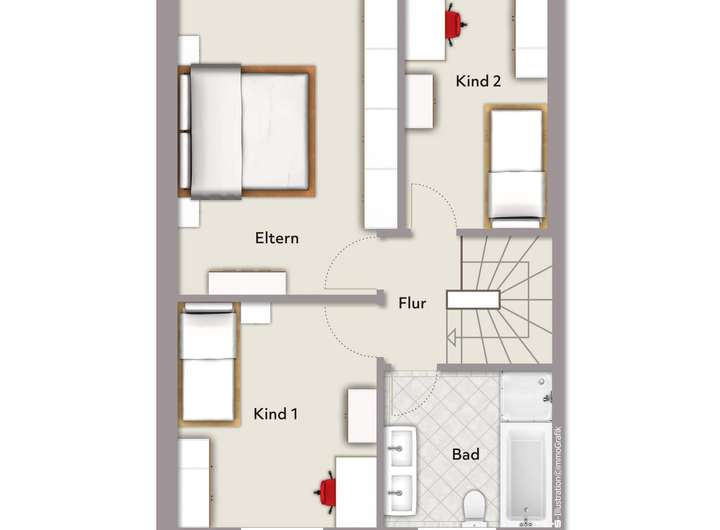 EG: Wohnzimmer, Küche, HWR, Gäste-WC, Garderobe/Abstellraum, Flur; Garage