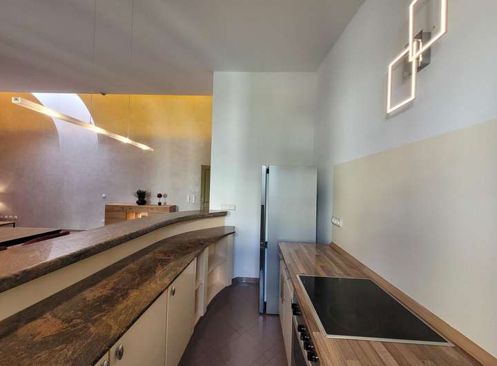 Küche sowie Wohn- und Schlafzimmer sind hochwertig gefliest. Die Wohnung besitzt eine offene Küche mit Theke.