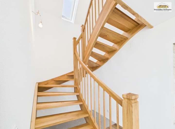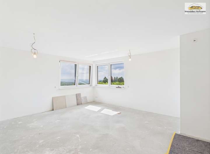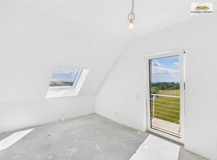 Der helle Wohn-/Essbereich mit großen Fensterflächen bietet viel Licht und Weite. Der Balkon befindet sich am Schlafzimmer im Obergeschoss. Die Einliegerwohnung verfügt über einen ebenerdigen Zugang zur Terrasse. Teilbereiche des Innenausbaus sind noch offen und lassen sich nach Wunsch finalisieren. Das amtlich vermessene Grundstück umfasst ca. 368 m².
