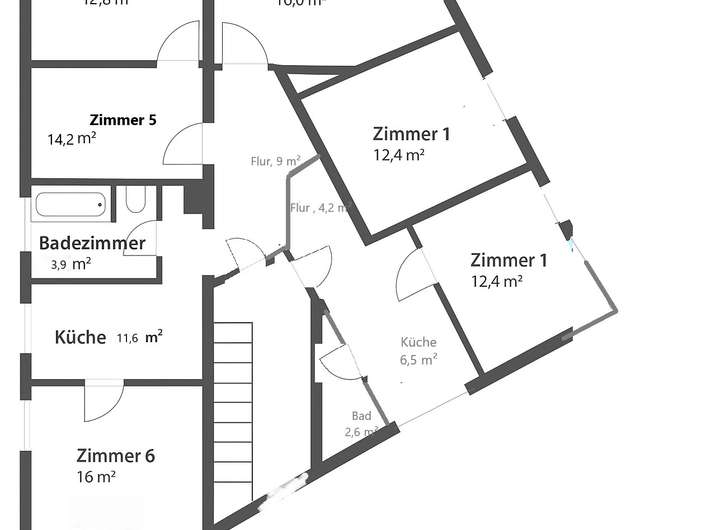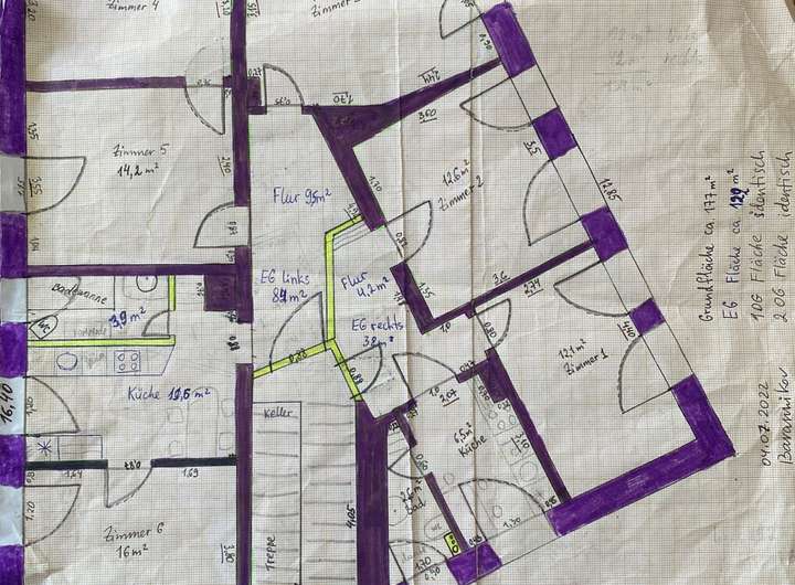 • 1. Obergeschoss: zwei Wohneinheiten, zusammen ca. 133 m² – vollständig vermietet (Kaltmiete pro Zimmer 500,00€, insgesamt aktuell ca. 2.000,00€)