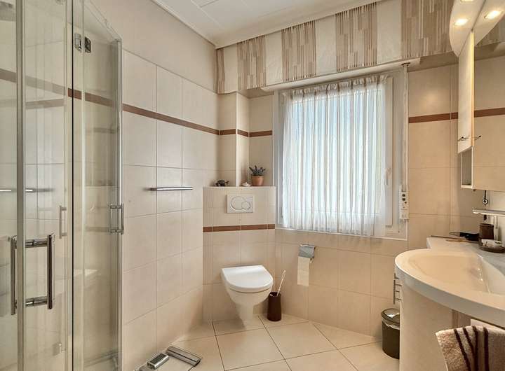 - stilvolles Badezimmer (aus 2015) mit ebenerdiger Dusche, Glasduschkabine und Fenster