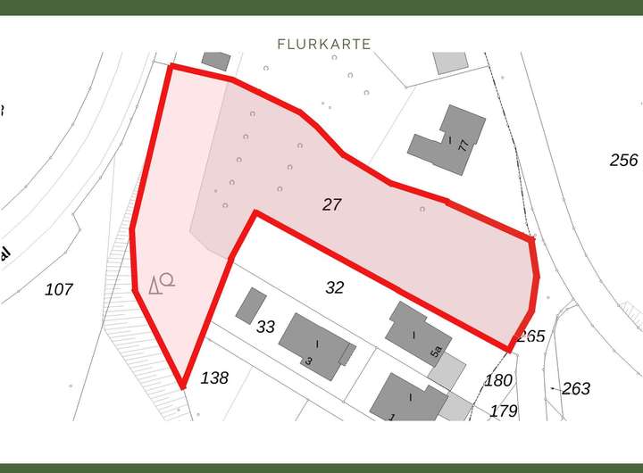 Die Topografie des Grundstücks ist leicht abschüssig. Die Bebauung des Wohnhauses erfolgt im oberen Bereich, während sich Gartenflächen, Pool, Nebengebäude oder weitere Gestaltungselemente ideal im unteren Teil des Grundstücks anlegen lassen. Den Abschluss bildet ein kleiner, leicht ansteigender Waldstreifen.