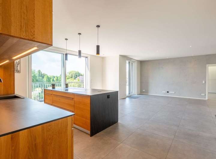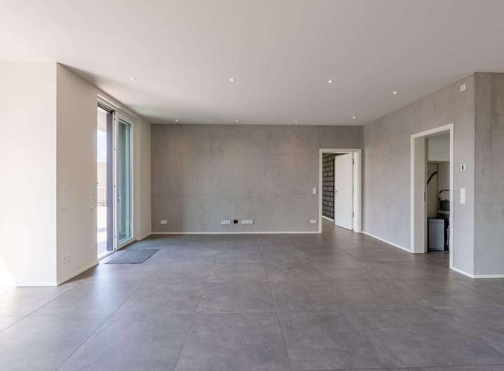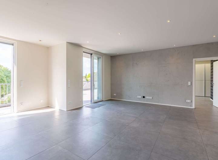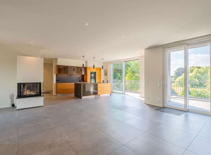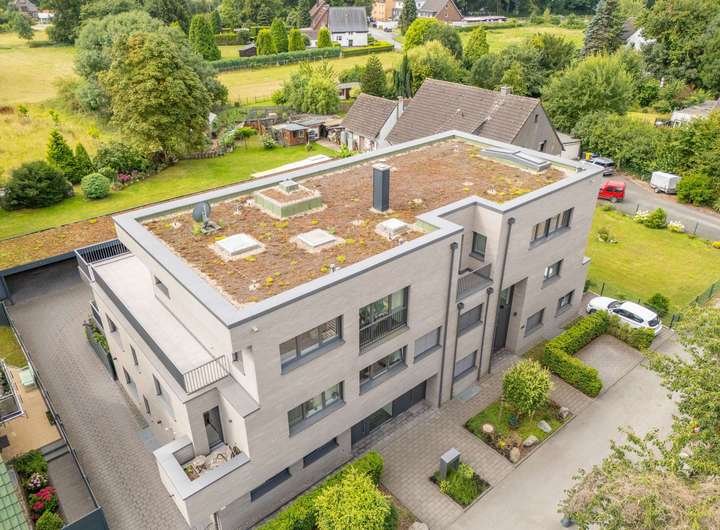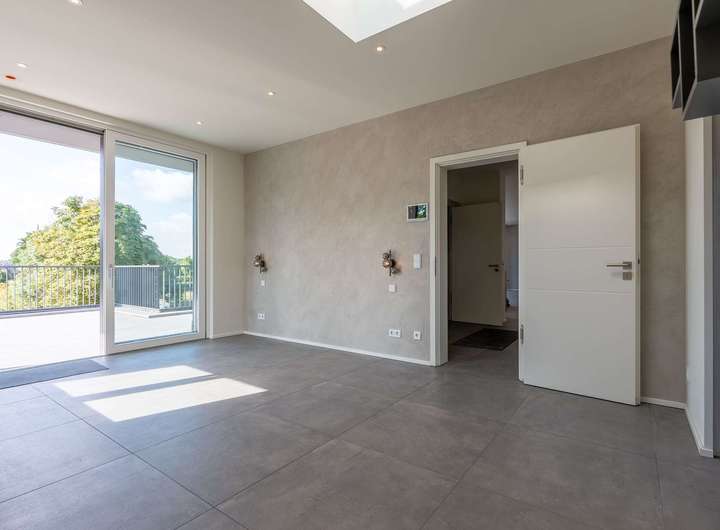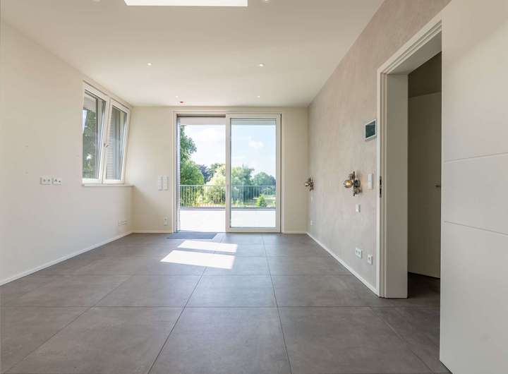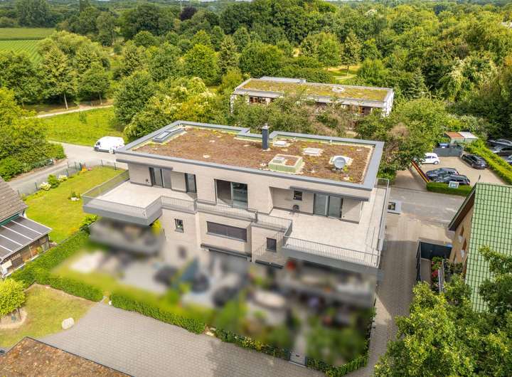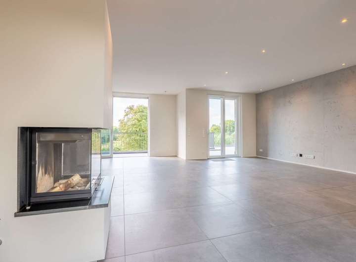 Dieses exklusive Penthouse erstreckt sich über das komplette 2. Obergeschoss eines modernen Flachdachgebäudes mit nur sechs Wohneinheiten – in ruhiger Lage an den Feldern zwischen dem Warmen und dem Kalten Eigen. Der unverbaute, phänomenale Weitblick über die angrenzende Feldlandschaft verleiht der Wohnung eine ganz besondere Qualität.