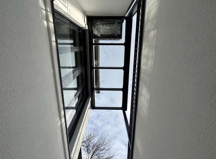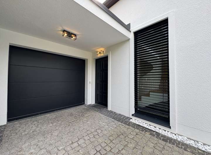 Elektrische Aluminium-Rollläden in schwarzgrau, einzeln steuerbar und zusätzlicher Zentralsteuerung (Fa. Roma)