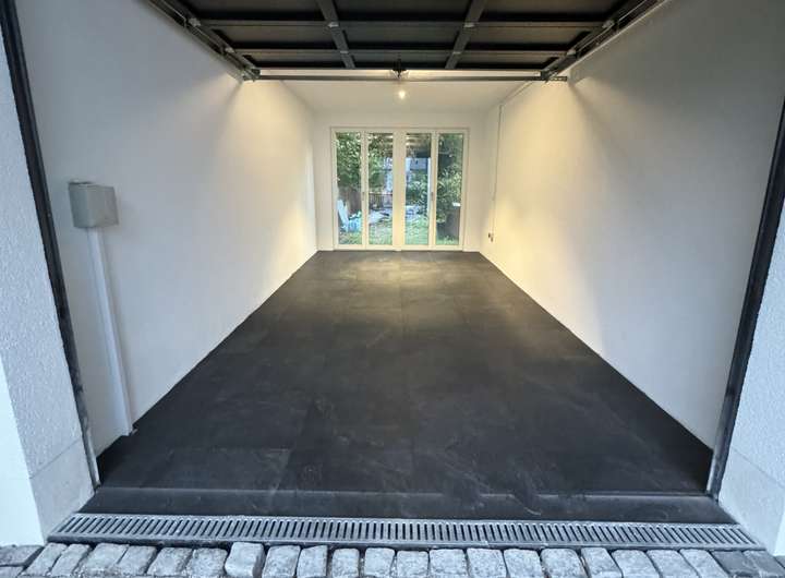 Sehr geräumige Einzelgarage mit grossem Fenster und dunkelgrauem Fliesenboden mit Starkstromanschluss (Vorbereitung)