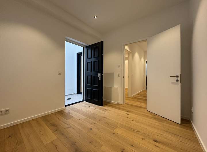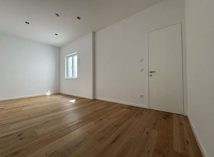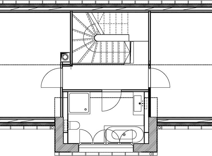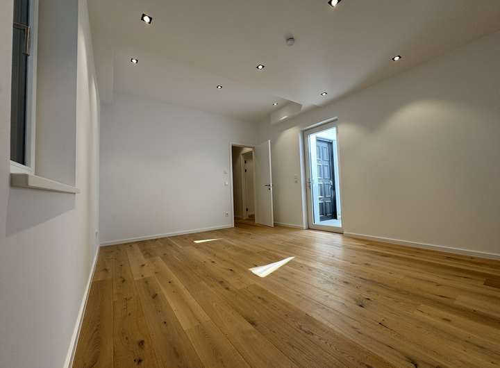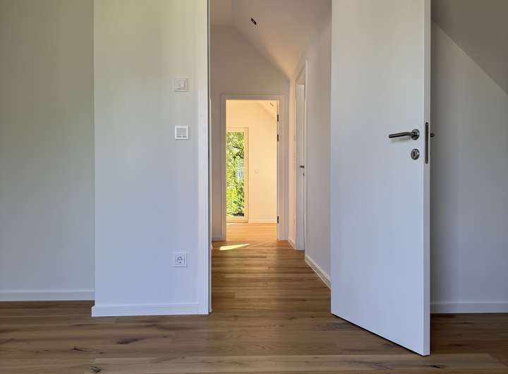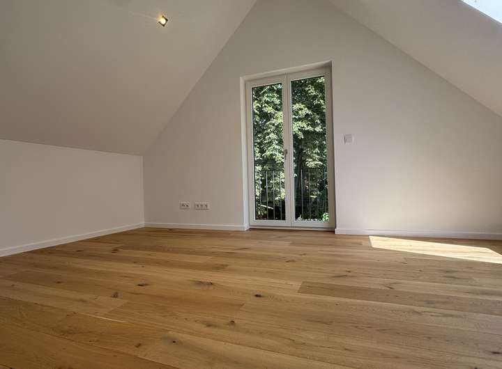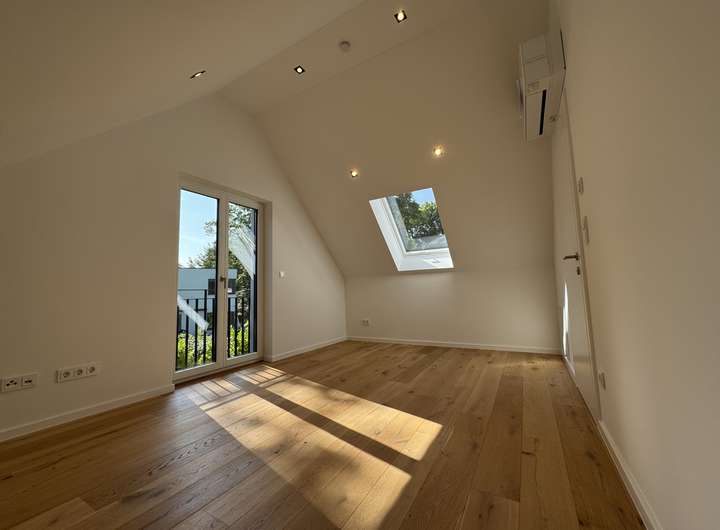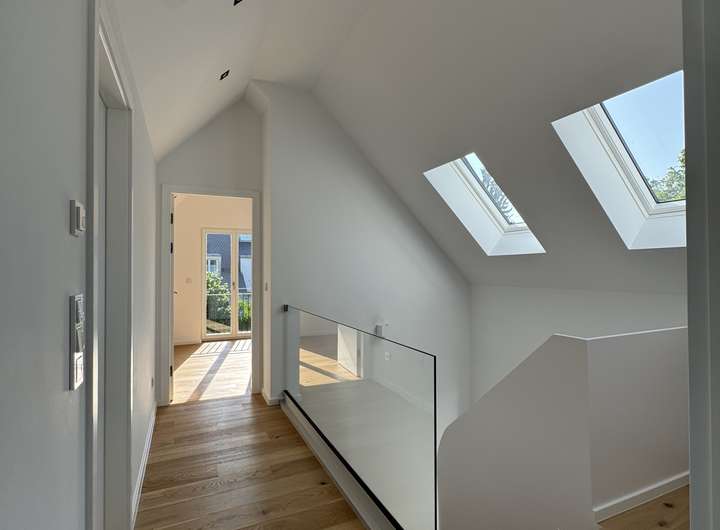 Das Obergeschoss verfügt über zwei gleich große Zimmer mit bodentiefen Fenstern und französischen Balkonen davor und ist durch die zahlreichen Dachflächenfenster absolut lichtdurchflutet. Das mittig angeordnete Badezimmer (Doppel-Waschtisch, bodengleiche Rainshowerdusche mit Duschtrennwand in rahmenlosen Einscheibensicherheitsglas und Wanne) hat eine Lichtkuppel.