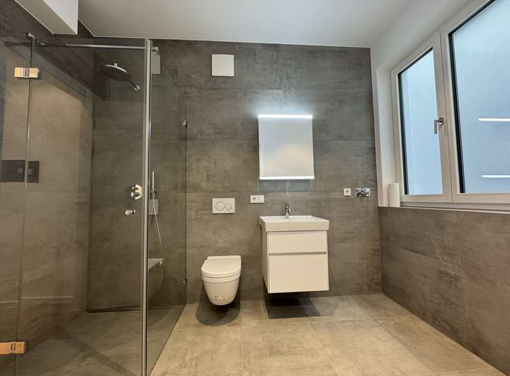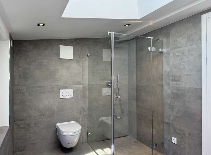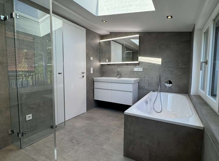 Großformatige Feinsteinfliesen: Boden- und Wandfliesen in den Bädern (bis zu 1,20 m x 1,20 m)
