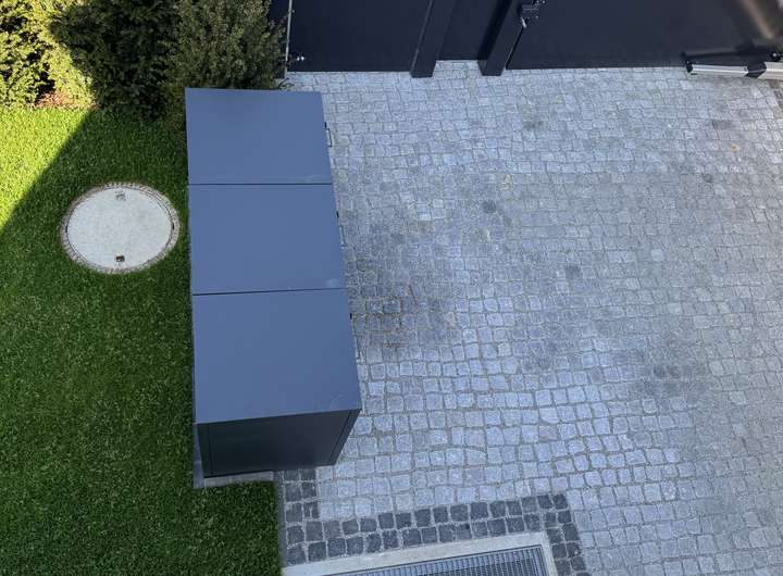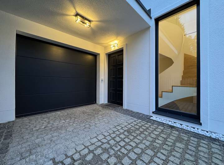 Die Villa verfügt über eine eigene mit Basalt-Kleinsteinen gepflasterte private Vorfahrt, die in eine großzügige Einzelgarage führt. Die Vorfahrt kann mit einer Länge von ca. 11 Metern auch als zusätzliche Parkmöglichkeit genutzt werden und ist zur Straße durch ein elektrisches Tor abgegrenzt.