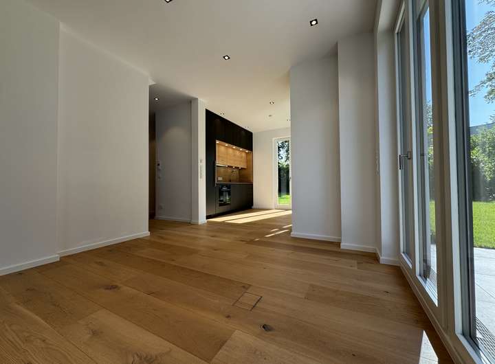 Das Einfamilienhaus wurde im Stil neuer klassischer Tradition mit exklusivem Wohnambiente erstellt: Eine durchdachte helle Raumaufteilung mit imposant hohen Decken (2,95 m Raumhöhe im Erdgeschoss und Souterrain, im Obergeschoss im offenen Giebel 3,20 m hoher Luftraum) in Kombination mit hochwertiger Ausstattung wie Fußbodenheizung, Klimaanlage im OG, Eichenparkett und großformatigen Feinstein-Fliesen.