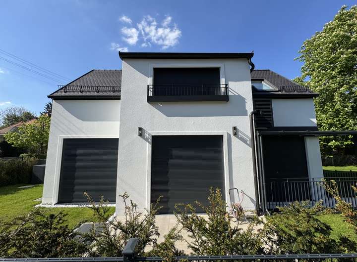In der Außensprache hat die Villa ein stilvolles Fassadenkonzept anthrazit/weiß. Das klassische Erscheinungsbild mit dem straßenseitigen Giebel und Putzfaschen um Fenster und Türen beeindruckt durch zeitlose Eleganz.