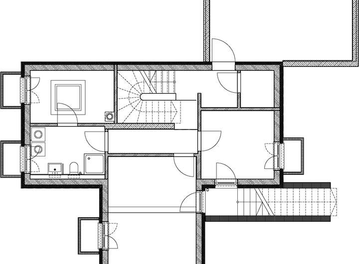 Auf der Westseite des Hauses befindet sich ein Tiefhof, der über eine Außentreppe das Untergeschoss mit einem zweiten Haustüreingang erschließt. Das Untergeschoss mit drei Zimmern bietet durch das komplett ausgebaute Bad Möglichkeiten zur freien Gestaltung und verschiedene Nutzungen, z.B. auch als Büro oder Einliegerwohnung.