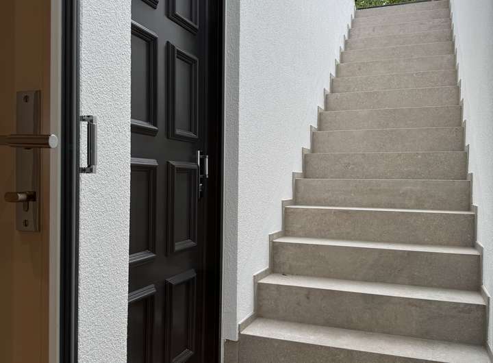 Elegante sandfarbene Feinsteinzeugplatten in Natursteinoptik (Terrasse, Gartenweg, Aussentreppe) (Fa. Die Fliese, Ismaning)