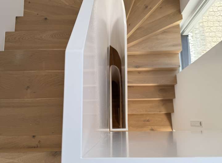Geschwungene klassische Schreinertreppe mit Holzwangentreppen in Faltwerkoptik