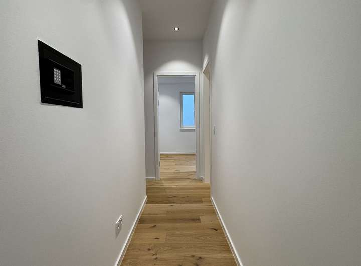 Landhausdielenparkett in Eiche im gesamten Haus, weiße Sockelleisten