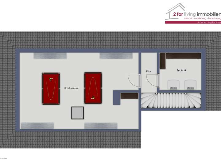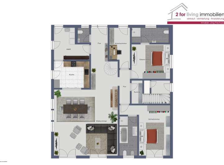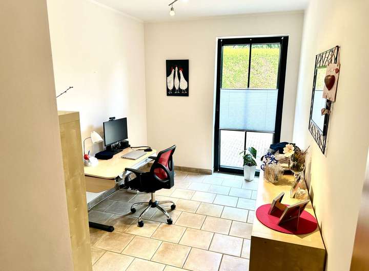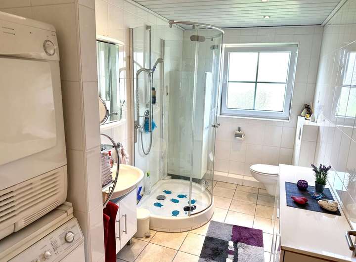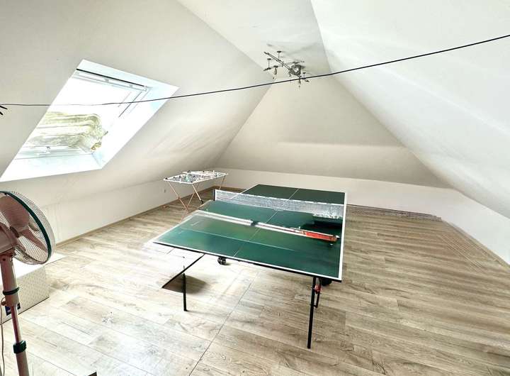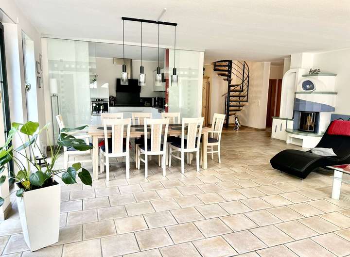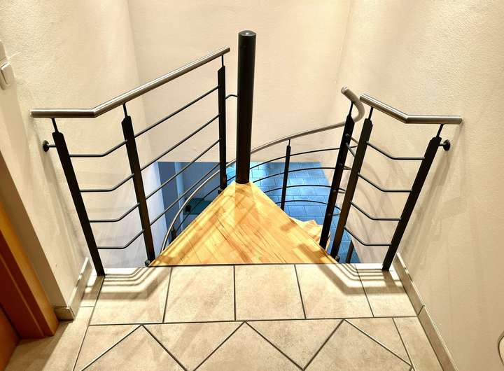 Des Weiteren führt vom Wohnraum eine offene Wendeltreppe in das Dachgeschoss, wo sich ein weiterer großzügiger Raum mit angrenzendem Duschbad befindet – ideal als viertes Schlafzimmer oder als ruhiges Büro etwas abseits des familiären Alltags.