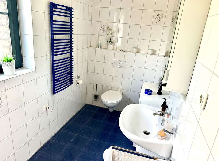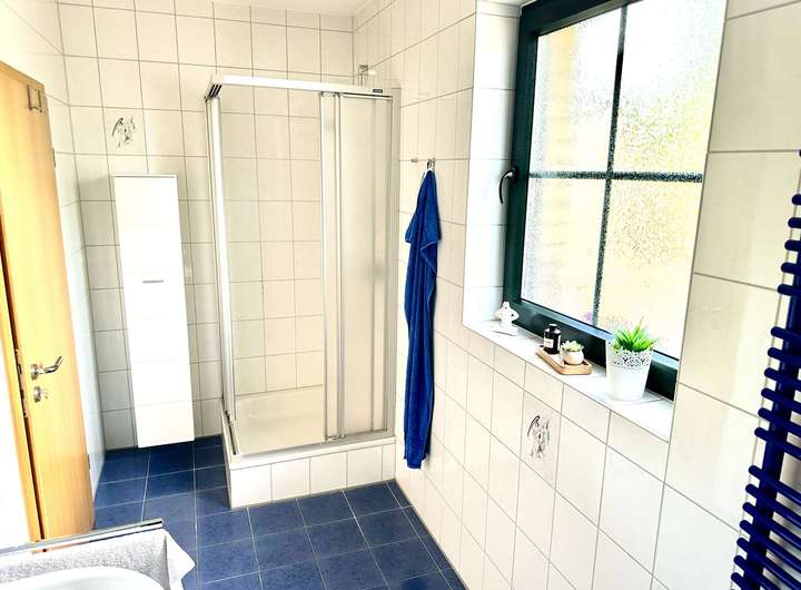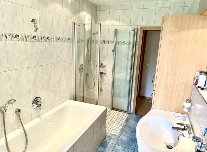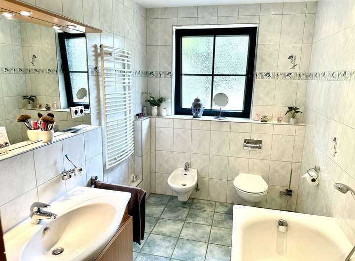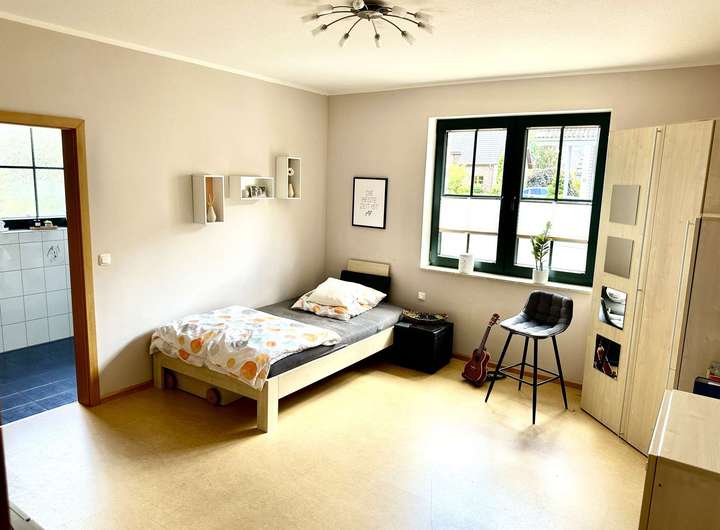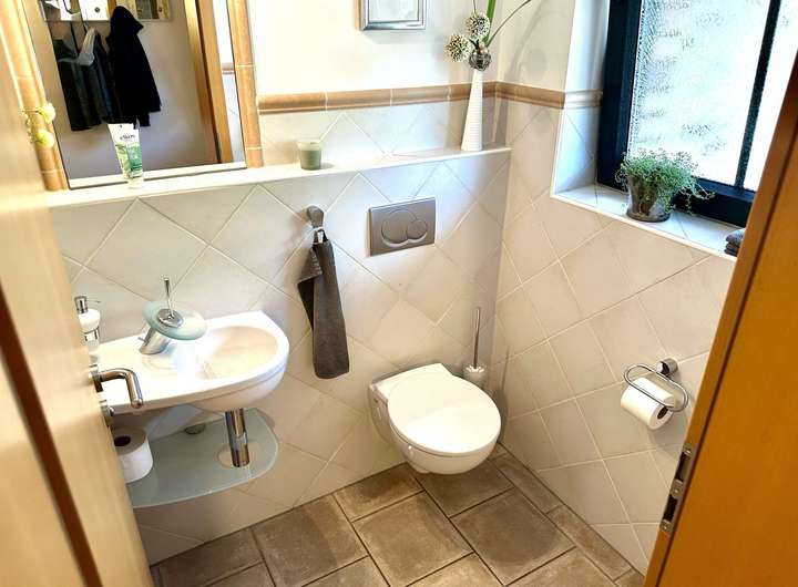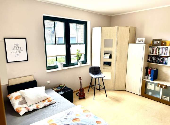 Weiterhin führt vom Wohnraum ein separater Flur zu den Privaträumen der Familie. Das Elternschlafzimmer verfügt über ein eigenes Bad en Suite – ein Tageslichtbad mit Badewanne und Dusche, das Entspannung und Komfort bietet. Gegenüber befindet sich das großzügig dimensionierte Kinderzimmer, das mit einem eigenen Duschbad versehen ist – eine gut durchdachte Lösung für das tägliche Familienleben. Ein dritter Schlafraum auf dieser Wohnebene steht als Gäste- oder Arbeitszimmer zur Verfügung. Abschließend ergänzen ein Gäste-WC im Eingangsbereich der Diele sowie ein praktischer Abstellraum das Raumangebot im Erdgeschoss.