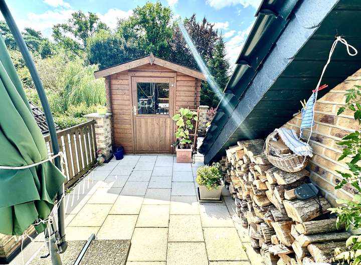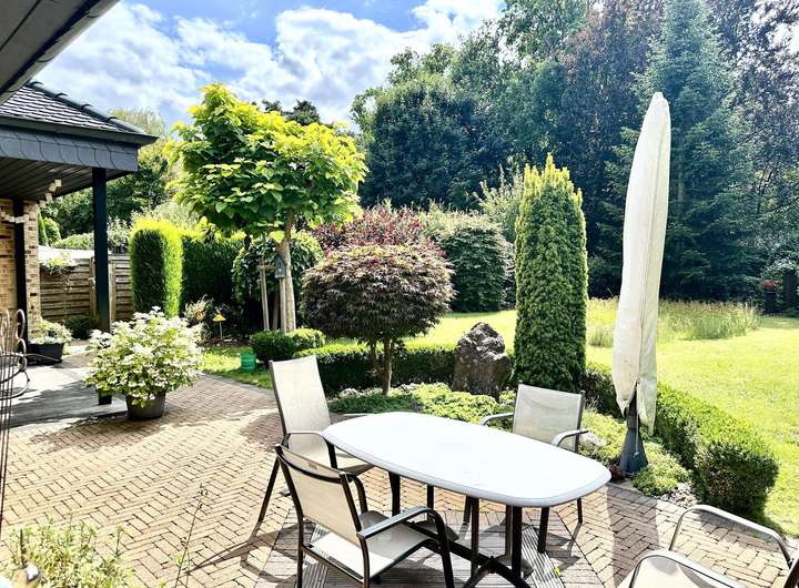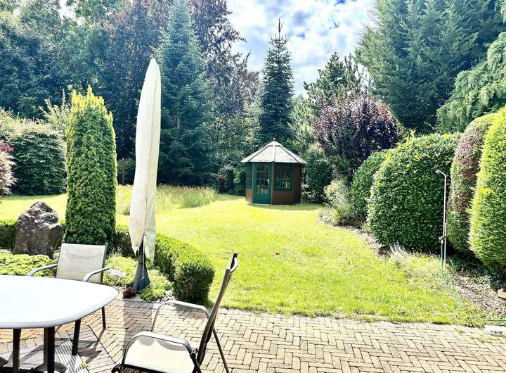 Der Außenbereich ist ein Paradies für Naturliebhaber! Eine teilweise überdachte Terrasse eröffnet den Blick in den herrlichen Garten mit einer großen Rasenfläche, einer blühenden Wildblumenwiese sowie üppiger Randbepflanzung. Ein außergewöhnlich gestaltetes Gartenhaus verleiht dem Außenbereich eine ganz besondere Note und bietet zusätzlichen Stauraum für Gartenmöbel und Accessoires.