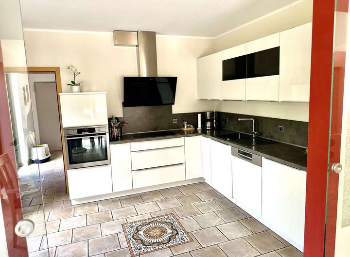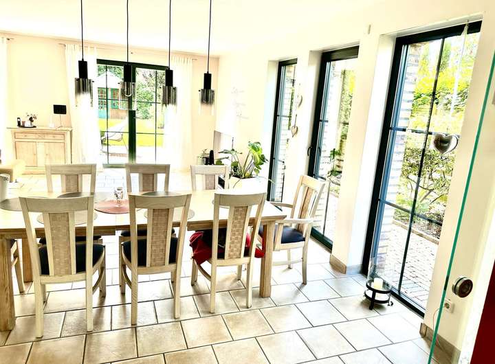 Des Weiteren lädt der freistehende Essbereich zu geselligen Abenden mit Familie und Freunden ein. Ein architektonisches Highlight ist an dieser Stelle die offen in den Wohnraum integrierte Küche, die sich bei Bedarf durch elegante Glasschiebeelemente zum Essbereich hin abtrennen lässt. Die maßgefertigten Küchenmöbel präsentieren sich in einem modernen, hellen Design und überzeugen durch höchste Funktionalität. Ein angrenzender Hauswirtschaftsraum mit einem direkten Zugang in die Doppelgarage rundet diesen Bereich perfekt ab.