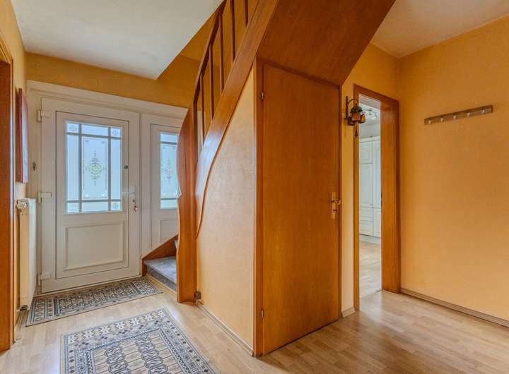 Im Inneren erwartet Sie eine durchdachte Raumaufteilung, die sowohl praktische als auch gemütliche Wohnbereiche bereithält. Zusätzlichen Stauraum schaffen ein großer Dachboden, ein Teilkeller sowie ein Hauswirtschaftsraum. Die Fenster bestehen aus pflegeleichtem Kunststoff und sind doppelt verglast, wodurch eine gute Wärmedämmung gewährleistet ist.