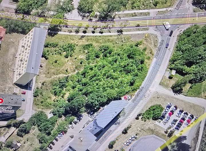 Das Grundstück, Flurstück 25/14, in der Ettersburger/Nordstr. ist umgeben von bis zu 4-geschossiger Wohn- und Gewerbebebauung.
