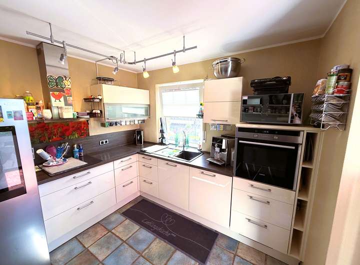 Die Küche ist mit einer Einbauküche ausgestattet, die im Kaufpreis enthalten ist. Durch das bodentiefe Fenster mit direktem Zugang zum Stellplatz werden Einkäufe besonders bequem ins Haus gebracht. Dank der großzügigen Aufteilung bietet die Küche zusätzlich ausreichend Platz für einen Esstisch mit Stühlen – perfekt für ein gemütliches Frühstück.