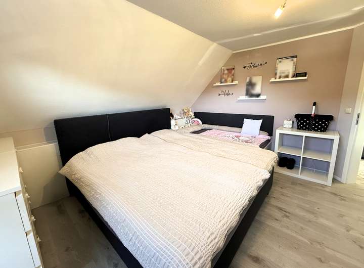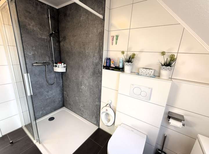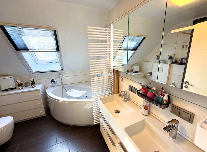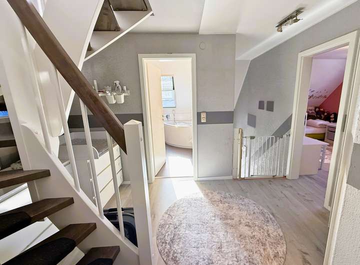 Im Obergeschoss befinden sich ein helles Kinderzimmer, ein großzügiges Schlafzimmer sowie das 2021 vollständig erneuerte Badezimmer. Die Ausstattung überzeugt mit einer Eckbadewanne, einer großen, fugenlosen Dusche, Doppelwaschtisch und moderner Gestaltung – funktional und pflegeleicht zugleich.