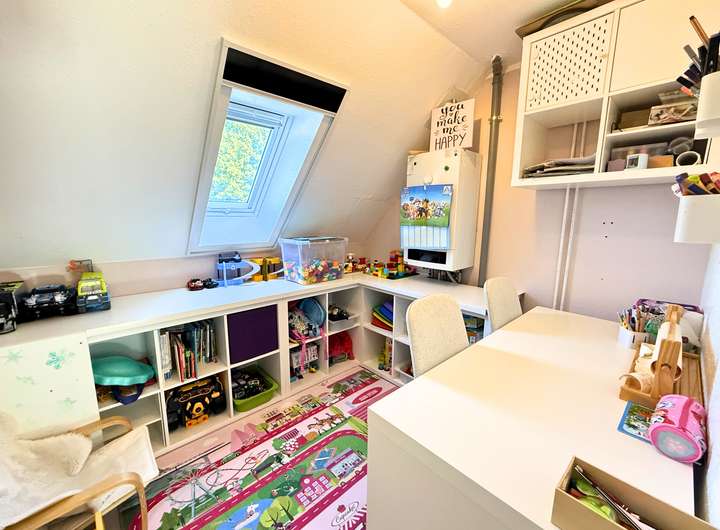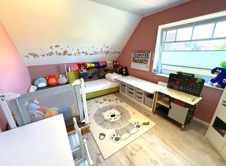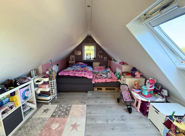 Das ausgebaute Dachgeschoss bietet ein weiteres, geräumiges Zimmer, das derzeit als Kinderzimmer genutzt wird. Neue Dachfenster sorgen für Helligkeit, ein Dachfenster mit Holzrahmen blieb erhalten.