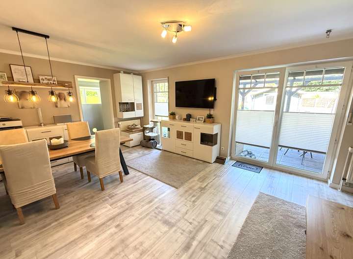 Das Herzstück bildet der großzügige Wohn- und Essbereich, der durch große Fensterfronten lichtdurchflutet ist und einen direkten Zugang zur ca. 25 m² großen, überdachten Terrasse bietet. Hier lässt sich der Blick in den gepflegten Garten genießen, der ausreichend Platz zum Spielen, Entspannen und für gesellige Grillabende bietet.