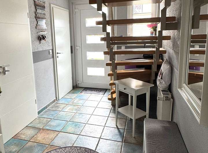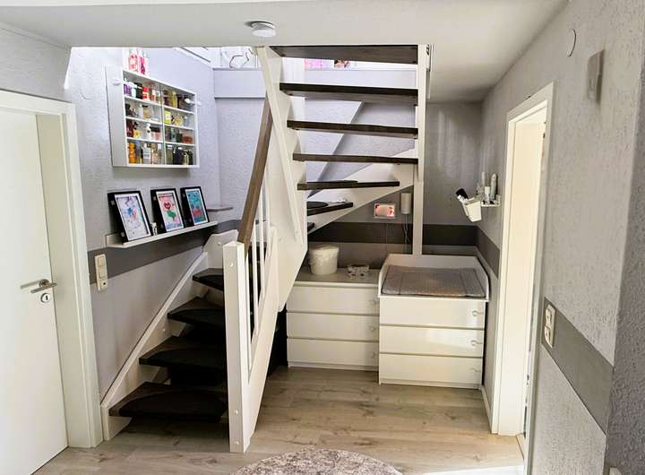 Beim Betreten des Hauses gelangt man zunächst in den einladenden Eingangsbereich. Gleich rechter Hand befindet sich das Gäste-WC, links führt eine elegante Holztreppe mit Metallgestell in das Obergeschoss. Ebenfalls im Erdgeschoss liegt der praktische Hauswirtschaftsraum mit Platz für Waschmaschine, Trockner und zusätzliche Haushaltsgeräte.