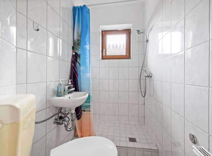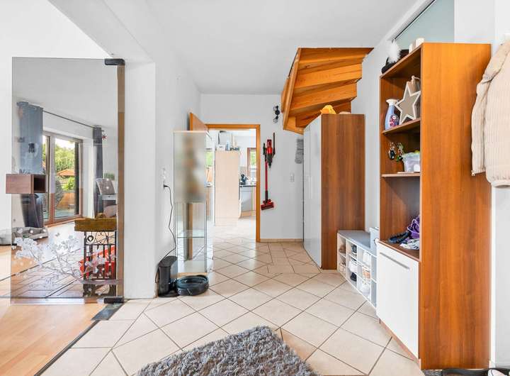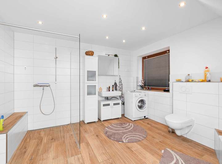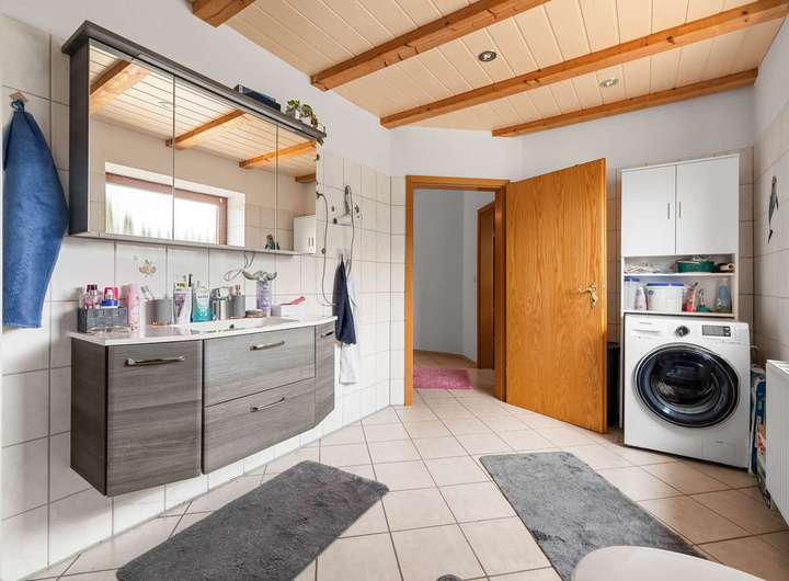 Das Erdgeschoss bietet darüber hinaus ein Elternschlafzimmer, ein Kinderzimmer sowie ein weiteres Zimmer, das flexibel als Büro oder Gästezimmer genutzt werden kann. Ein gepflegtes Gäste-WC mit Fenster sowie ein großes Tageslichtbad mit Waschmaschinenanschluss ergänzen das Raumangebot. Die verbauten Holzfenster stammen aus den 90er Jahren – sie sind funktionstüchtig, benötigen jedoch mittelfristig Pflege oder Erneuerung. Die Wohnräume sind mit Laminat ausgelegt, was eine warme, wohnliche Atmosphäre unterstreicht. Ein kleiner Technikraum beherbergt die Heizungsanlage.