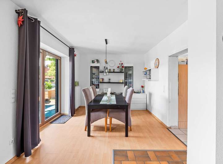 Schon beim Betreten des Hauses fällt das großzügige Raumgefühl ins Auge. Im Erdgeschoss öffnet sich der lichtdurchflutete Wohn- und Essbereich, der durch seine offene Gestaltung das Herzstück des Hauses bildet. Große Fenster lassen viel Tageslicht herein und schaffen eine freundliche Atmosphäre, während der Kamin an kühleren Tagen für wohlige Wärme sorgt. Besonders angenehm ist die direkte Verbindung zur Küche, die sich harmonisch an den Essbereich anschließt – ideal für einen offenen, kommunikativen Wohnstil. Auch die Terrasse, die mit rund 20 m² viel Platz für Erholung im Freien bietet, ist direkt vom Wohnbereich aus zugänglich.