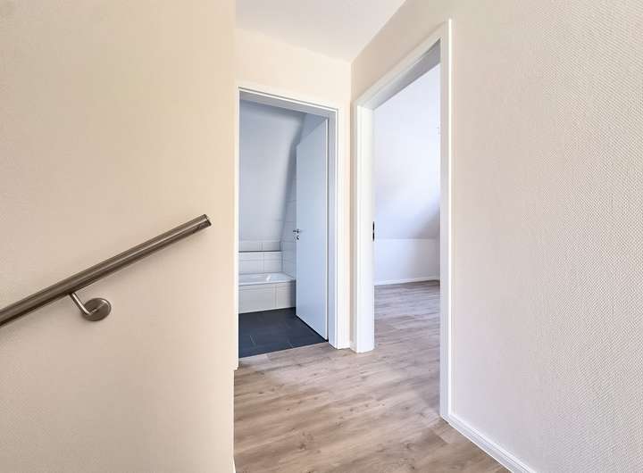Die Doppelhaushälfte verfügt über eine großzügige Raumaufteilung, die sowohl für Familien als auch für Paare ideal ist. Im Erdgeschoss befinden sich ein geräumiges Wohnzimmer, eine offene Küche mit Essbereich und ein Gäste-WC. Im Obergeschoss gibt es drei Schlafzimmer und ein modernes Badezimmer mit Dusche und Badewanne.