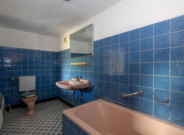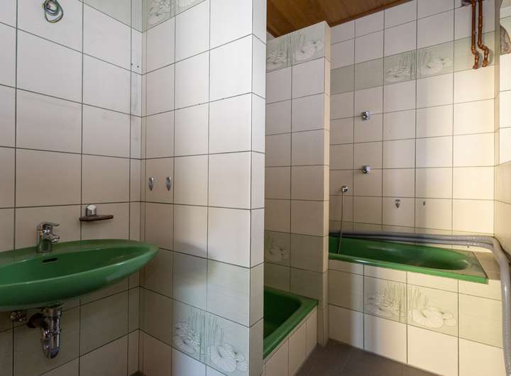 Die Bäder sind im Retro-Design der 60er- und 80er Jahre gehalten und bei den Bodenbelägen handelt es sich um eine Mischung aus pflegeleichten Fliesen und zeitlosen Laminatböden.